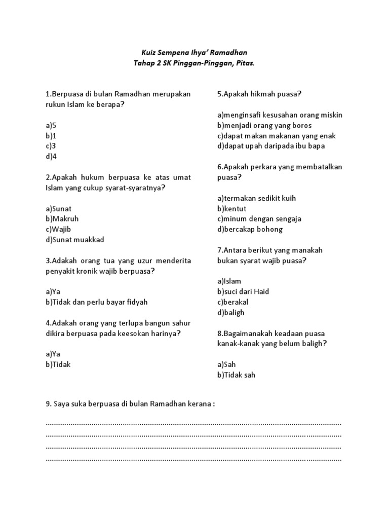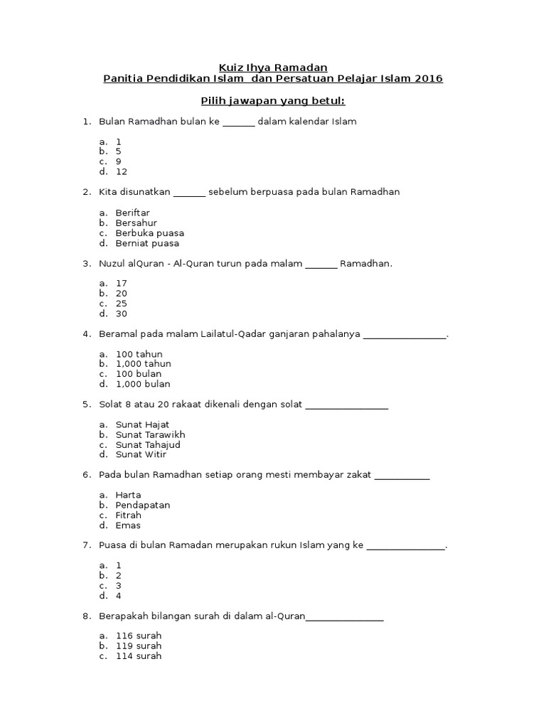 Kuiz ihya ramadhan tahun 2020 1441h. Soalan matematik format pt3 tingkatan 1. Dibuka padanya pintu-pintu syurga dan ditutup padanya pintu-pintu neraka ditambat.